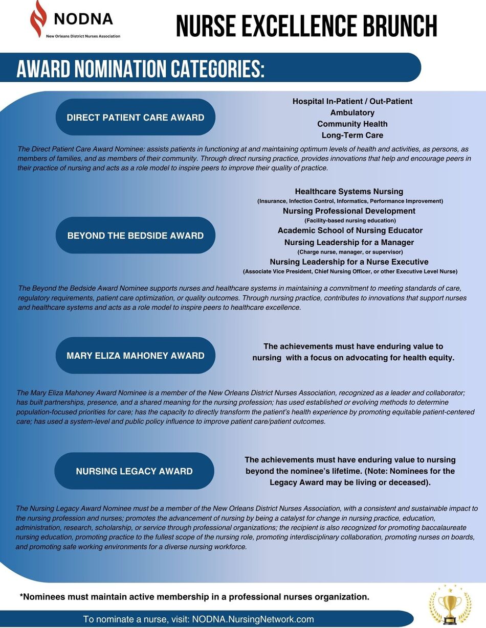 We are excited to announce the opening of nominations for the 2026 Crescent City Nurse Excellence Brunch, to be held during National Nurses Week on Saturday, May 9, 2026, at the Audubon Tea Room from 10:00 a.m. to 1:00 p.m.